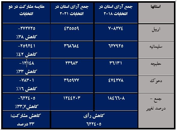 به طور کلی میزان مشارکت رأی دهندگان اقلیم کردستان در انتخابات سالهای ۲۰۱۸ و ۲۰۲۱ سیر نزولی داشته و میانگین این کاهش مشارکت ۳۳ درصد بوده است.