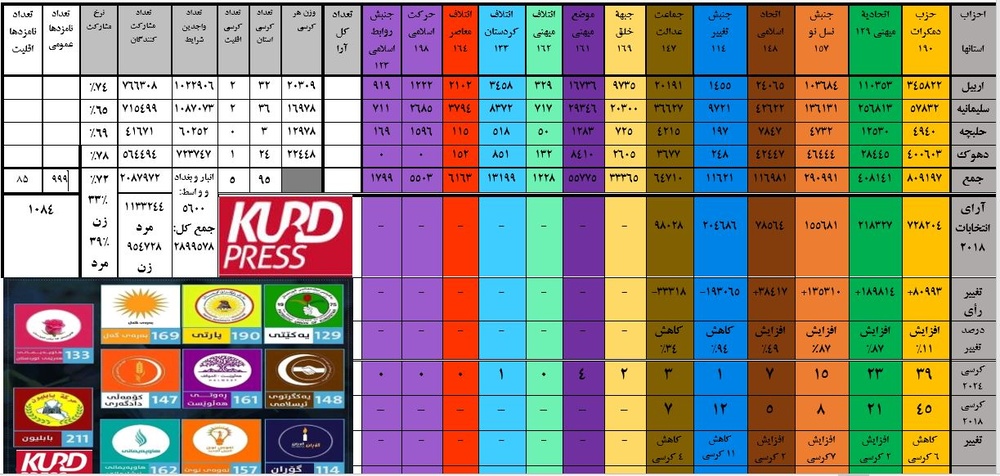 - جنبش نسل نو، بهعنوان یک نیروی نوظهور کە مبدأ پیدایش آن، کارزار مخالفت با برگزاری رفراندوم 2017 (اکنون نه) بود، با 290991 رأی در مجموع استانها، یکی از بزرگترین احزاب جدید است که در مناطق مختلف، به ویژه در سلیمانیه (136131 رأی)، قد علم کردە و بە رهبری تاجری جوان. در برخی از مناطق کردستانی به سطح رقابت با احزاب سنتی کردستان رسیده است.